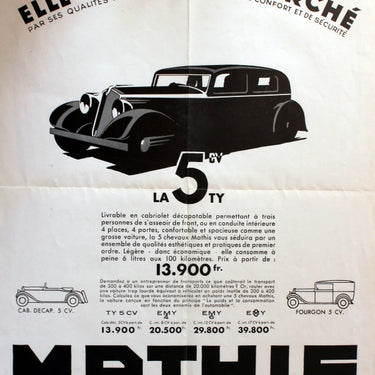 Original vintage car advertising poster for Mathis La 5CV convertible and van configuration. Art Deco design by Jean Jacquelin (1905-1989). Good condition, folded.