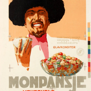 Original vintage Soviet printer's proof food advertising poster for Glavkonditer confectionery featuring a great illustration of a smiling man wearing a hat and holding a tea cup with a glass dish full of colourful sweets in the foreground. Good condition, hand written text at top and bottom of the poster, backed on linen.