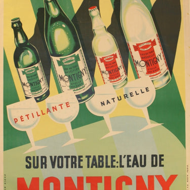 Original vintage drink advertising poster for the Montigny brand of mineral water sourced from Ile de France. Drinking Montigny water you are prolonging your life. Great design by Bernard Delcourt. Created by Sicar Rouen Paris. Great condition. Faint scuffs in image, minor bumps and tears along margins.