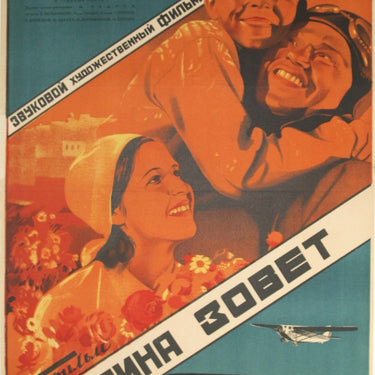 Original vintage Soviet movie poster for a film about the aviation success of a Civil War era test pilot Novikov - родина зовет / Motherland Calls / Call to Arms - directed by Aleksandr Macheret and starring Mikhail Kedrov, Ekaterina Melnikova, Aleksandra Popova. Great image featuring a pilot wearing a helmet and goggles hugging a young child next to a smiling lady with flowers in the foreground and planes below the diagonal title text design.