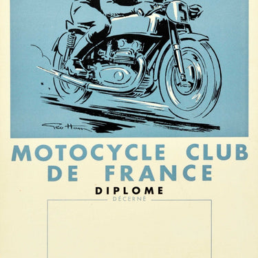 Original vintage motorsport diploma award poster - Motocycle Club de France Diplome Decerne MCF - featuring a dynamic illustration by Geo Ham (Georges Hamel; 1900-1972) depicting a motorcyclist in a helmet and goggles driving a motorbike at speed above the title text and box for the award, the winged MCF logo below. Very good condition, minor staining, minor creasing, backed on linen.