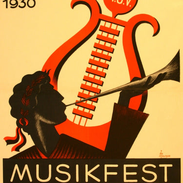 Original vintage Art Deco poster advertising a music festival in Germany from 5-7 July 1930. MusikFest Sobernheim 1830, 1920, 1930. Good condition, fold in middle, repaired tear.