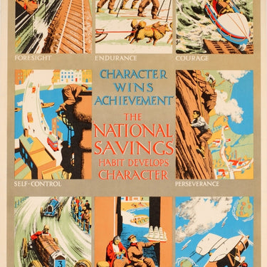 Original vintage National Savings poster: Character Wins Achievement The National Savings Habit Develops Character featuring colourful illustrations - a steam train approaching a signal marked Foresight; men and husky dogs with sledges fighting again the snow and wind marked Endurance; lifeboat men on their way to help a ship in rough seas marked Courage; two workers at the top of a chimney high above a city street marked Self-Control; two rock climbers high above the countryside marked Perseverance; a classic car race marked Sound Judgement; an elderly couple sitting on a dock, the lady knitting and the man holding up a model ship with boats and people on the beach behind them marked Patience; and a propeller plane flying over clouds with land and ships and sea visible below marked Self-Reliance - with the text in the centre. No 216 issued by the National Savings Committee Westminster SW1. Printed for HM Stationery Office by Howard Jones Roberts and Leete Ltd London. Very good condition, restored small tear on left margin, backed on linen.