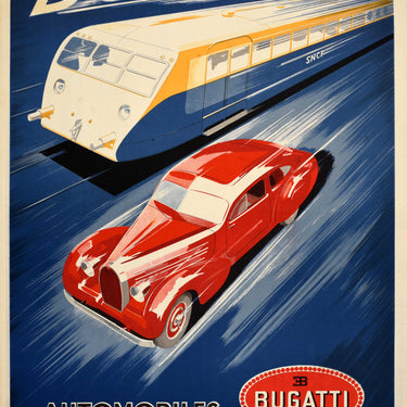Original vintage advertising poster for Bugatti cars and Bugatti railcar trains used by the PLM and SNCF networks featuring a dynamic design depicting a classic red Bugatti Type 64 car speeding alongside a high-speed Bugatti railcar on a blue background between the stylised text - Bugatti Automobiles Autorails Molsheim (Alsace) - and Automobiles Ettore Bugatti logo. Printed by Ateliers W. Fischer Litho. A. Michel Strasbourg. Excellent condition, minor staining on margins, backed on linen.