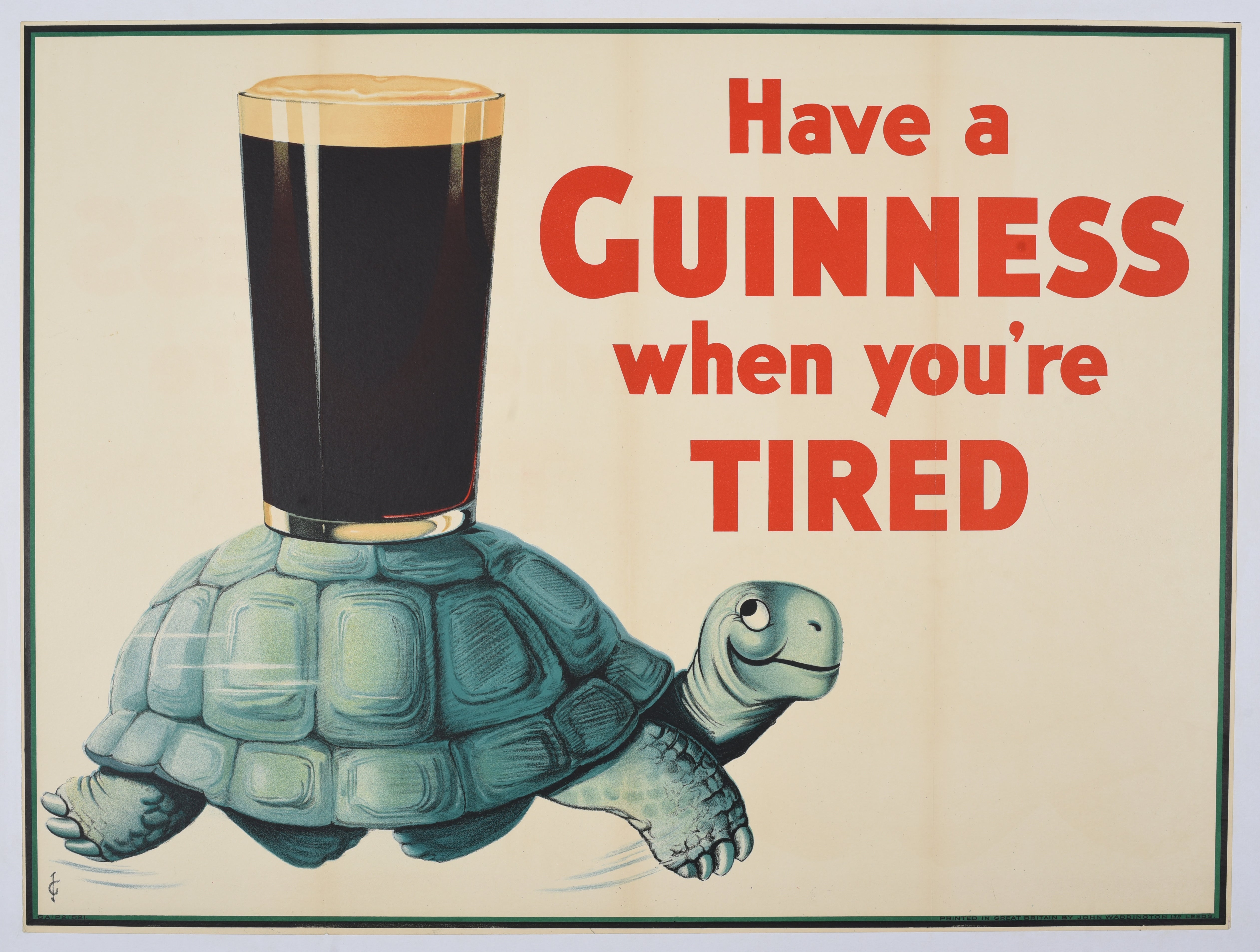 Original vintage advertising poster for the iconic drink Guinness Irish stout beer - Have a Guinness when you're tired - featuring a smiling turtle carrying a pint glass of Guinness on its shell with the bold text in red. One of the world's most popular beer drink brands, Guinness is an Irish dry stout founded by Arthur Guinness in Dublin in 1759. Artwork by the notable artist John Gilroy (John Thomas Young Gilroy; 1898-1985). Horizontal. Excellent condition, restored folds and minor tears, backed on linen.