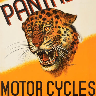 Original vintage advertising poster for Panther Motor Cycles Powered for Mastery Phelon & Moore Ltd Cleckheaton and London. Great image of a jaguar baring its teeth against a dynamic yellow and white background, the title in bold black and deep red lettering diagonally above and rest of the text below. Based in Yorkshire north England, Phelon & Moore (Joah Carver Phelon and his nephew Richard Moore) manufactured Panther motorcycles from 1904-1968. Good condition, small restored tears, small restored paper losses, minor staining, backed on linen.