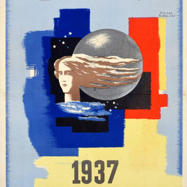 Original vintage advertising poster for the Paris 1937 Exposition Internationale / International Exhibition held from May to November featuring a great design by Paul Colin (1892-1985) depicting a lady with her hair blowing in the wind around a globe with blue and white stars above and below and block colours in black, red, blue and yellow painted on the grey blue background. The Exposition Internationale des Arts et Techniques dans la Vie Moderne / International Exposition of Art and Techniques in Modern Life was held from 25 May to 25 November 1937; the programme included boxing matches, motor boat and horse races, a dance festival, theatre performances and other sport and art events. Good condition, restored folds, restored tears, staining, backed on linen.