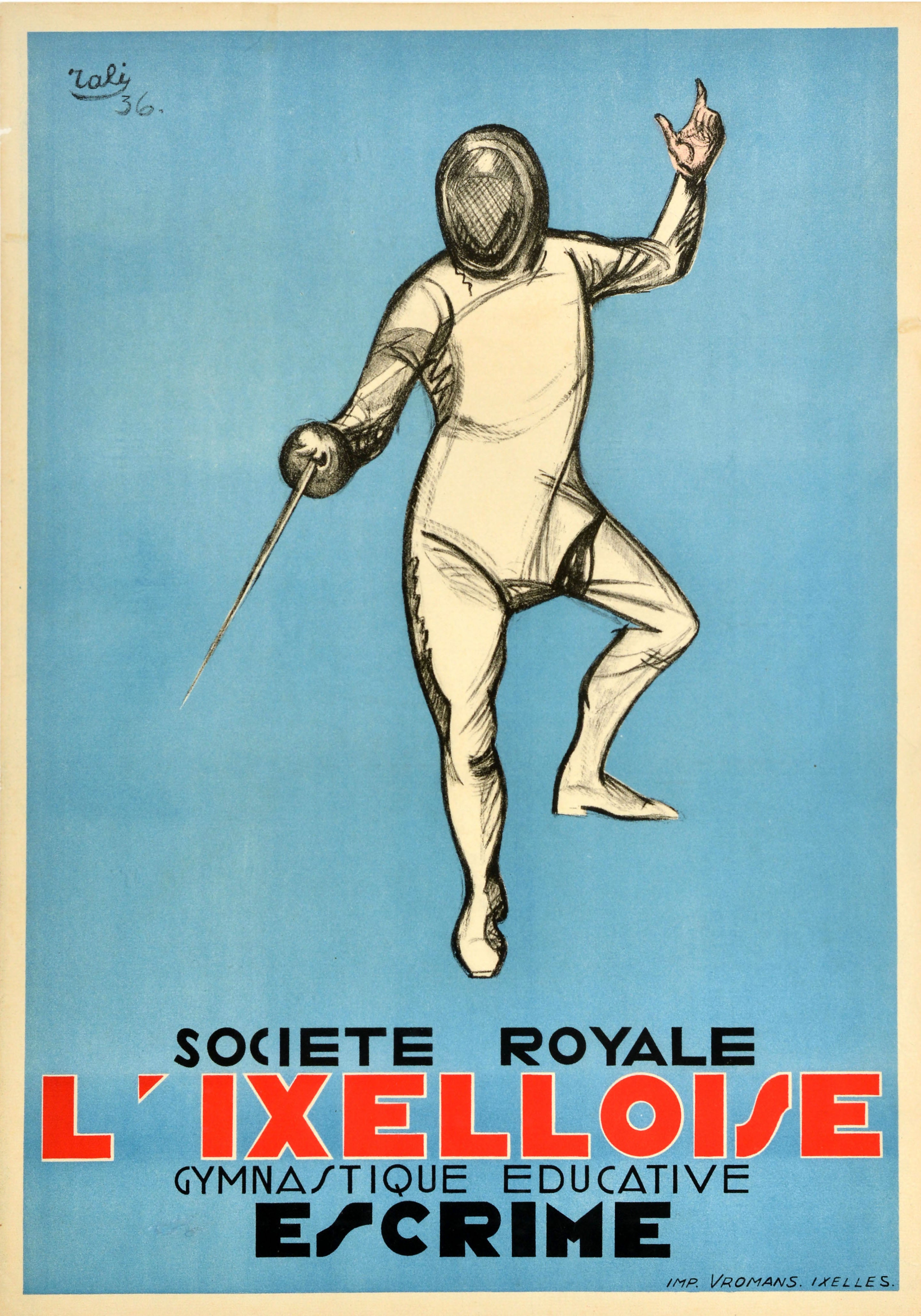 Original vintage sport poster advertising the Societe Royale l'Ixelloise Gymnastique Educative Escrime / Royal Society of Educational Gymnastics in Ixelles Belgium featuring an image of a fencer standing in an on-guard fencing pose in black and white on a light blue background, the bold red and black text below. Printed by Vromans, Ixelles. Good condition, restored tears, restored paper losses, staining, backed on linen.