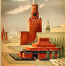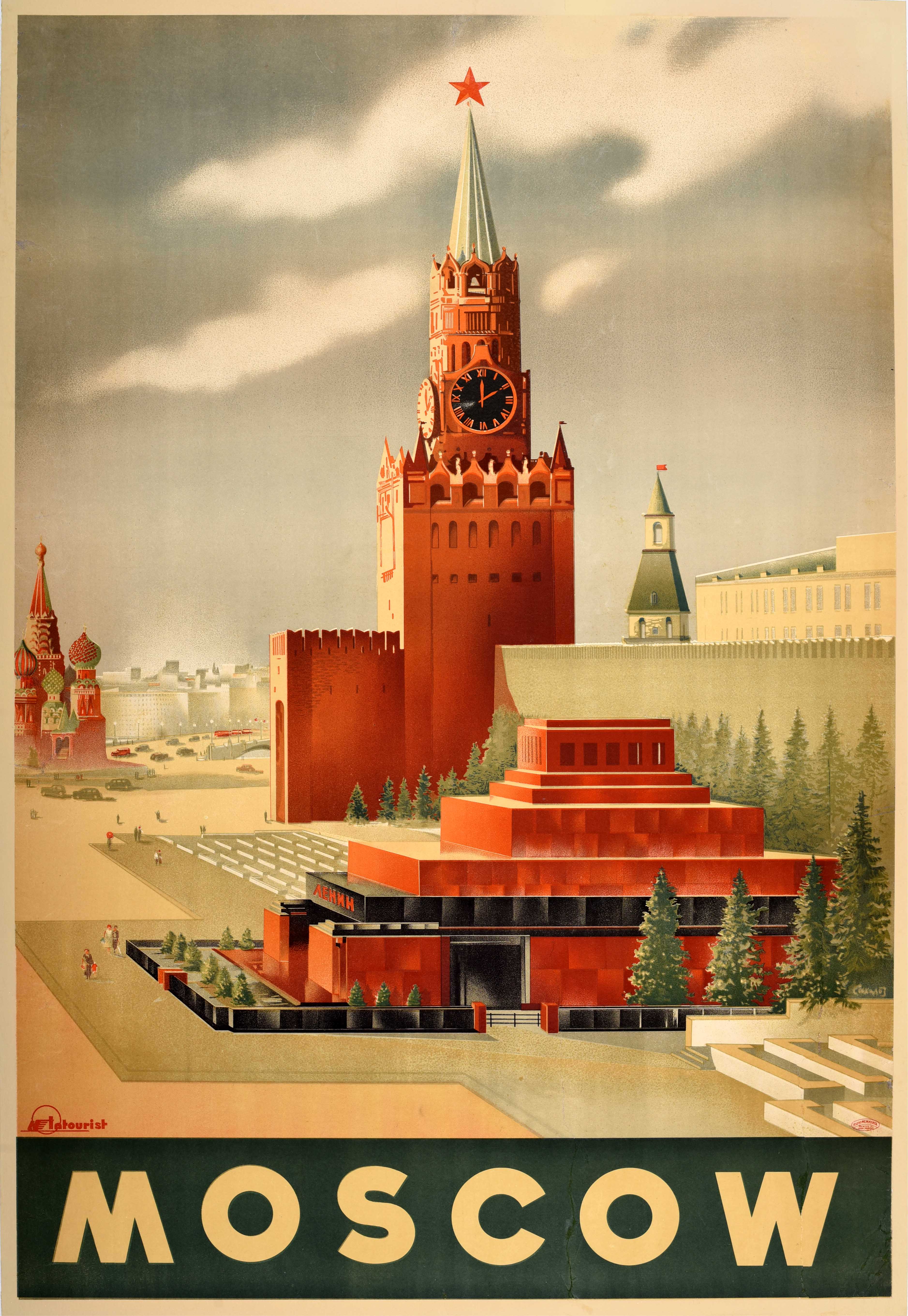 Original vintage travel poster for Moscow issued by the Soviet state tourism agency Intourist featuring a great design by Sergei Sakharov (1906-1969) depicting a view of Red Square with people walking and cars crossing the bridge over the Moskva River behind the historic St Basil's Cathedral (built 1561), the Kremlin Spasskaya Tower (opened 1491) with the clock on the side and red star at the top of its spire against the lightly clouded sky, a red flag flying at the top of one of the internal buildings in the background and trees around Lenin's Mausoleum in the foreground, the bold title text below. Good condition, restored tears, restored paper losses, staining, backed on linen.