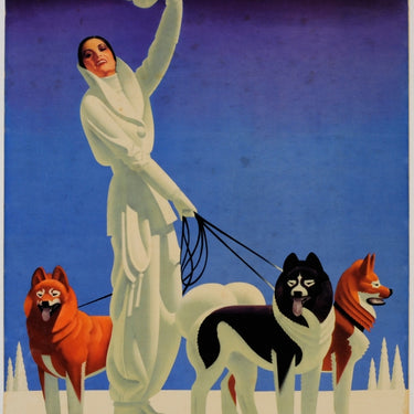Original vintage travel advertising poster for the luxury Pullman railway services. Stunning Art Deco illustration against a blue background featuring an elegant lady wearing a white winter coat and raising her hat up to the viewer, holding three dogs on a leash with snow covered trees on the horizon. The Pullman Company 1935 Chicago Printed in the USA. Artwork by William Welsh. Fair condition, missing the bottom of the poster, stains on margins, backed on linen.