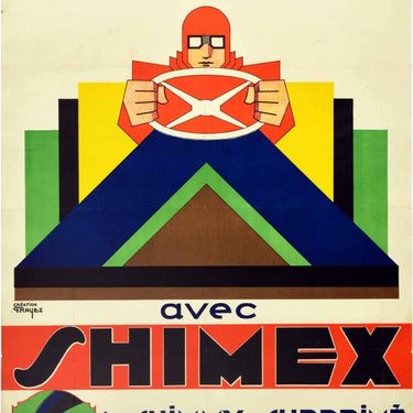 Original vintage advertising poster for steering wheel shimmy by Shimex - Direction Stable et Sure avec Shimex. Le shimmy supprime plus de reactions dans le volant / Stable and Sure Steering with Shimex. The shimmy removes more reactions in the steering wheel - featuring a great vector graphic design of a driver in a red helmet and goggles holding his hands on the steering wheel with brown, green and blue triangular and yellow, black and green rectangular shapes forming a racing car and a smaller magnified image below next to the stylised Art Deco lettering in blue and black set against a white and red background. Good condition, folds, staining, small paper losses, backed on linen.