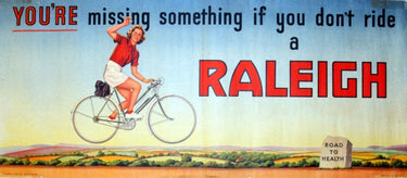 Original vintage advertising poster promoting Raleigh bicycles - Road to Health, you're missing something if you don't ride a Raleigh. Printed by Hudson & Son Ltd, Birmingham. Good condition, fold, minor losses, faint tape marks.