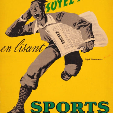 Original vintage advertising poster - Soyez Sport en lisant Sports "Sport Libre" dans la clandestinite le quotidien de tous les sportifs (read Sports the daily life for all athletes). Dynamic image of a man holding the Sports paper calling out and running against a yellow background. Good condition, restored tears and minor loss on margins, backed on linen.