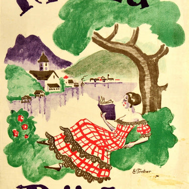 [ON RESERVE PENDING PAYMENT] Original vintage advertising poster for Rikola Bucher / Rikola Books featuring colourful artwork of a lady relaxing in a red and white checked dress lying under a tree and reading a book with a village on the other side of the lake and hills on the horizon, the bold stylised lettering above and below. Printed in Salzburg. Acceptable condition, creasing, large stain at bottom right, pinholes, tears in margin.