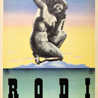 Original vintage travel poster for Rhodes / Rodi issued by the Italian State Travel Agency ENIT featuring a design by Erberto Carboni (1899-1984) depicting a photo of the ancient Aphrodite of Rhodes statue showing her kneeling on the island of Rhodes as a cloud with a pink, yellow and blue sky in the background and the bold black title lettering on the green shaded Mediterranean Sea with a decorative row of pink rose flowers below. The 2nd-1st century BC Hellenistic Aphrodite of Rhodes statue was discovered in 1923 and is now on display in the Archaeological Museum of Rhodes Italy. Rhodes and the other Dodecanese Islands were under Italian control from 1912 to 1943 after Italy seized them from the Ottomans during the Italo-Turkish War (1911-1912). Printed By Pizzi and Pizio Milano Roma. Good condition, restored paper losses, restored tears, minor staining, backed on linen.