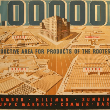 Original vintage advertising poster for Rootes Group, manufacturer of Humber, Heelman, Sunbeam, Thrupp & Maberly, Commer, Karrier brand of cars, trucks and buses. 5 million square feet productive area for products of the Rootes Group. This skillfully designed Art Deco poster features all the facilities of the group in different parts of the UK and Australia: London, Birmingham, Manchester, Luton, Stoke, Brighton and Fishermen's Bend with headquarters in Devonshire House in the middle. Designed by Edgar Longman and printed for the Export Division of Rootes Group London by the Haycock Press in England. Reference number 1023EX. Great unfaded colours, bold graphics. Excellent condition. Some minor unobtrusive tears along margins.