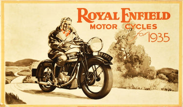 Original vintage poster advertising Royal Enfield Motor Cycles for 1935 featuring a great image of a smiling man on a shiny new motorbike with the number plate RE 1935 on the front, driving along a country road with hills in the distance and trees below the bold title text in Art Deco style lettering. Horizontal. Fair condition, tears, paper losses, staining, backed on board.