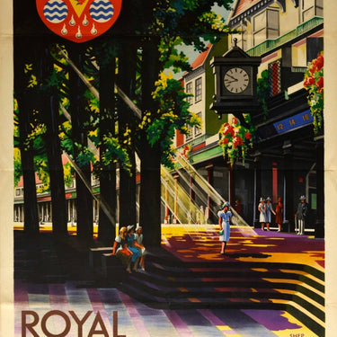 Original vintage Southern Railway poster for Royal Tunbridge Wells in Kent featuring colourful artwork by Charles Shepard (1844-1924; 'Shep') showing a scenic view of the Tunbridge Wells High Street with sunlight shining through the tall trees to smartly dressed people walking and standing below the clock above the historic shops and decorative flower baskets, the town's coat of arms (1889-1972) above and the text below - Royal Tunbridge Wells guide free from information bureau Express trains Cheap fares by Southern Railway. Located 30 miles from Central London in Kent, Tunbridge Wells is a popular spa town that became Royal Tunbridge Wells in 1909, granted by King Edward VII. Very good condition, folds.