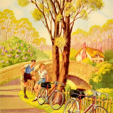 Original vintage advertising poster - Get There on a Rudge Britain's Best Bicycle - featuring two people taking a break from cycling in a countryside with their shiny new Rudge bikes against a fence under a tree by an old stone bridge with flowers and a thatched cottage on the other side, the young man leaning on one knee and smoking a pipe and the young lady looking down to the river below, the bold stylised lettering in black and red above and below with the triangle Rudge logo and Raleigh Industries logo. Good condition, tears and pinholes at margins, backed on linen.