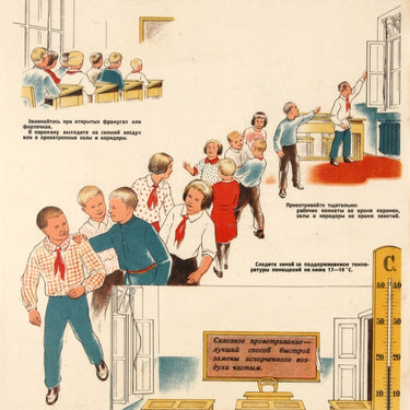 Original vintage Soviet Russian propaganda poster: Fresh air strengthens health and improves quality of education - featuring three different illustrations showing school children (some wearing red Pioneer scarves) sitting behind their desks in class with a small window open, children leaving their class in line with one opening a large window and below an image of an empty classroom with open windows and a thermostat reading 18 degrees Celsius. Very good condition, minor loss and tears on margins.