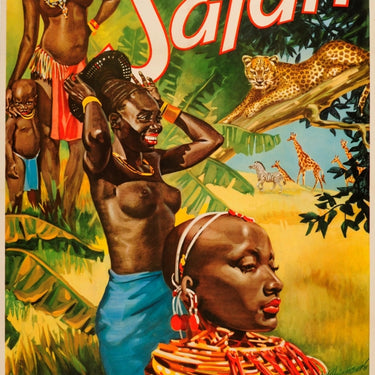 Original vintage movie poster for a documentary film Safari – With Wilhelm Eggert across Africa – a 1939 Wilhelm Eggert German/Swiss Africa documentary narrated by Erwin Hartung. Colourful artwork featuring an African lady wearing traditional necklace and earring jewellery in the foreground with two other ladies smiling behind her, one fixing her headdress and the other holding a small child at her side, looking towards some giraffe and zebra running across the savanna in the background, a cheetah lying on a tree branch below the stylised title text in white and red letters, the rest of the text below in black letters. Printed by August Scher Nachf, Berlin. Nazi censorship stamp on top left corner. Large size. Very good condition, restored folds and tears, minor paper losses and staining. Backed on linen.