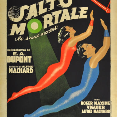 Original vintage cinema poster for a circus drama film Salto Mortale (le saut mortel) / Trapeze (the fatal leap) directed by the German director Ewald Andre Dupont and based on a novel by the French author and actor Alfred Machard. Stunning dynamic Art Deco style design featuring two acrobats flying up towards a trapeze bar against a dark background with a spotlight shining on them from the O in the stylised title text above, the female acrobat wearing a red outfit and the male acrobat wearing a blue outfit. Artwork by the French poster artist and designer Jean Adrien Mercier (1899-1995). Large size. Good condition, restored folds, tears and loss on folds and top right corner, backed on linen.