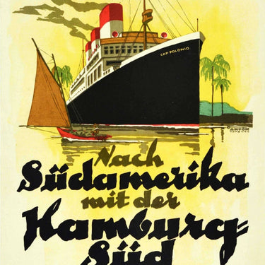 Original vintage cruise travel poster - To South America with Hamburg Sud / Nach Sudamerika mit der Hamburg Sud - featuring stunning artwork by the German painter and graphic artist Ottomar Anton (1895-1976) of the SS Cap Polonio ocean liner on reflective water with the steam rising into the yellow sky, hills and palm trees on the land visible in the background and a sailing boat in the foreground, the bold stylised lettering below with text on a black banner - Hamburg South American Steamship Company / Hamburg Sudamerikanische Dampfschifffahrts Gesellschaft. Launched in 1914 the Cap Polonio steamship served the Hamburg Germany to Buenos Aires Argentina route; she was briefly commissioned as an auxiliary cruiser in WWI then transferred to the UK Government in 1918; after sailing under the management of Union-Castle Line and P&O she was bought back by Hamburg Sud in 1921; in 1931 she was laid up and her interior parts sold to create the luxury Hotel Cap Polonio in Pinneberg Germany; she was scrapped in 1935. Good condition, restored tears, restored pinholes, staining, backed on linen.