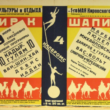Original vintage advertising poster: Soviet Circus. 1930s constructivist design featuring the programme of events, a ball and pole balancing act and train of camels. Horizontal. Good condition, folded, repaired tears.
