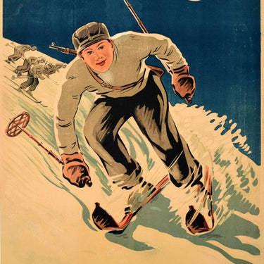 Original vintage Soviet poster for the All Union Voluntary Sports Society - Let's prepare new reserves of skiers for the Red Army! Dynamic artwork featuring a skier skiing towards the viewer at speed with the snow spraying up in front of other skiers on the slope behind him, the text against the blue background above and below. Good condition, restored paper losses, restored staining, restored tears, restored folds, backed on linen.