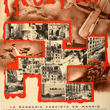 [ON RESERVE 1/9/25] Original vintage Republican Spanish Civil War propaganda poster - Culture! Fascist Barbarism in Madrid / ¡Kultur! La Barbarie Fascista en Madrid - featuring a photomontage design with a red shape of a Nazi Swastika outlining black and white photos of a war torn Madrid showing building ruins and victims of attacks with illustrations of planes and smoke from explosions in the background below the stylised dripping red title text across the top, the information on the numbered photos below with the National Confederation of Labour / Confederación Nacional del Trabajo CNT and International Workers' Association / Asociación Internacional de Trabajadores AIT logos. Issued by the National Committee (Propaganda Section) / Comité Nacional Sección Propaganda. Good condition restored paper losses in margins.