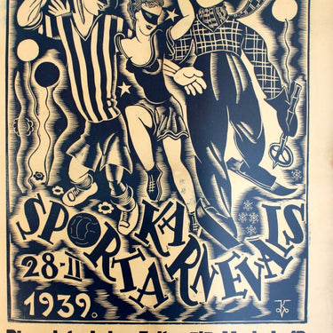 Original vintage advertising poster for the Sports Carnival in Riga: Sportisti un sporta draugi! (Athletes and sports friends!). 28 February 1939. Fun design featuring three people wearing masks - a football player wearing a striped top, a lady holding a ball, and a skier - with balloons, stars, snowflakes and flowers in the background and the event information below. Good condition backed on japan paper, restored folds and minor losses.