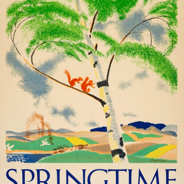 Original vintage travel advertising poster: Springtime Comes First In The South – Take A Cheap "Go-As-You-Please" Ticket And Get There Quickly By Southern Electric – Southern Railway Advertising. Scenic illustration by Rojan (Feodor Rojankovsky; 1891-1970) featuring two squirrels sitting on a birch tree branch with its fresh green leaves blowing in the wind in front of colourful fields and birds flying over water and the stylised text below. Very good condition, light staining, small tears on top, restored pinhole on top left corner, backed on linen.