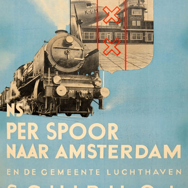 Original vintage travel advertising poster: KLM Take the NS train to Schiphol Airport featuring a photomontage design on a blue background with the text above and below black and white photographs of a steam train and a KLM plane in front of the airport building. Schiphol Airport (originally opened in 1916 as a military air base), located near Amsterdam is the main airport for the Netherlands and for KLM (Koninklijke Luchtvaart Maatschappij / Royal Dutch Airlines; since 1919), the flag carrier of the Netherlands. Good condition, fading, restored pinholes, backed on linen.