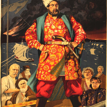 Original vintage movie poster for an epic Soviet historical drama about the Cossack hero leader Stepan Razin (Stepan Timofeyevich Razin; 1630-1671) who led the 1670-1671 uprising against the Tsarist oppressors, directed by Ivan Pravov and Olga Preobrazhenskaya and starring Andrei Abrikosov, Vladimir Gardin and Elena Kondrateva. Dynamic image of the bearded Stepan Razin in a traditional Cossack hat with a dagger and gun on his belt, standing with his arms on his hips in the foreground with people looking up at him and sailing ships at sea in the background, the decorative title text above against the cloudy sky. Good condition, restored tears, pinholes and minor loss on margins, backed on linen.