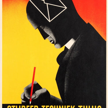 Original vintage poster for Studying Engineering at Home PBNA Arnhem. Colourful Art Deco style poster for the Polytechnisch Bureau Nederland Arnhem (PBNA; since 1921) - the polytechnic university for technical training and education based in Arnhem in Holland - featuring a stylised grey image of a man holding a red pencil studying with the white PBNA Studying at Home logo (an envelope with wings) over his head and the text below yellow and red letters. Very good condition, faint folds and creases.