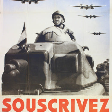 Original vintage World War Two poster: Subscribe to Armament Bonds - Souscivez aux bons d'Armement. Great photomontage by Pierre La Garrigue of WWII tanks with bomber planes flying overhead. Photo by LaGarrigue and Parnotte, Printed by Schuster, Paris. Fair condition, folded as issued, creasing, several tears on edges, staining, creased edges.