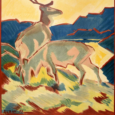 Original vintage travel poster - Summer Night In Norway - featuring stunning artwork by the Norwegian painter and illustrator Gert Jynge (1904-1994) depicting two deer grazing on the grass in the foreground, the hill above a fjord with mountains in the distance below a yellow sky background, the bold stylised lettering above and below. Published by Norwegian State Railways and printed in Oslo. Good condition, restored tears, restored paper losses on corners, restored folds, staining, backed on linen.