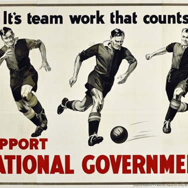 Original vintage sport themed 1935 General Election political propaganda poster for the British Conservative Party - It's Team Work That Counts Support National Government - featuring a great illustration depicting a game of football showing three footballers passing the ball and running with one player kicking the football between the bold black motivational text above and bold red lettering below. Printed and published by S.H. Benson Ltd Kingsway Hill, London WC2. Horizontal. Large size. Very good condition, restored folds, minor paper loss and tears, printed on 3 sheets, backed on linen.