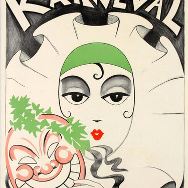 Original vintage advertising poster for the Skuespillernes Karneval Palladshotellet / Actors' Carnival at the Palace Hotel featuring a colourful image of a lady wearing a large ruffed pantomime clown collar and holding a mask with the text above and below in white and red. Printed by A/S L. Ihrich. Very good condition, creases in margins, tape marks on corners and minor tear on left margin.