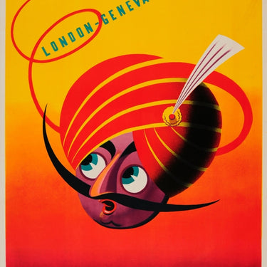 Original vintage travel advertising poster for London - Geneva - Cairo - Bombay - by Air India International. Colourful and fun image featuring a man with a long moustache wearing a turban swirling up to a propeller plane flying overhead with the text running diagonally above and below. Very good condition, restored tear on bottom margin, backed on linen.