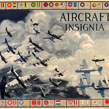 Original vintage World War Two propaganda poster commissioned by the army as an aircraft recognition chart for use in basic army training showcasing different aircraft insignia identification markings with various types of military planes depicted flying over a cloudy grey sky including a Fokker, B24, Stirling, Hurricane, Messerschmitt and Mitsubishi among others, surrounded by a colourful border of aircraft insignia including the British Empire, France, Germany, Japan, Russia and the United States. Artwork by the British artist and author Jack Coggins (Jack Banham Coggins; 1911-2006) who moved to America in 1923 and enlisted with the US Army in 1943. Prepared and distributed by Army Orientation Course, Special Service Division Army Service Forces, War Dept., Pentagon, Washington. D.C. Horizontal. Very good condition, restored folds and restored loss on bottom margin, backed on linen.