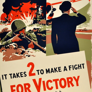 Original vintage World War Two American Airlines poster: It takes 2 to make a fight for victory - American Airlines AA - We are American. Image of a soldier in full army gear in a battlefield trench, shooting his gun with explosions behind him, and a man wearing a hat saluting the pilots in an American Airlines plane, flying a flag above the cockpit. Code DR 4-45. Silkscreen. Very good condition, restored creases, backed on linen.