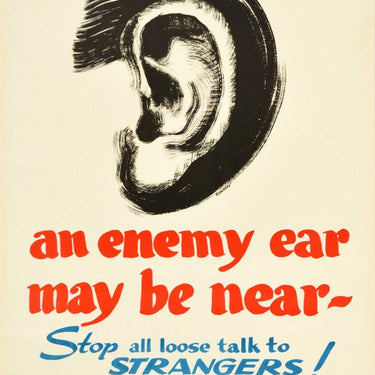 Original vintage World War Two home front espionage poster - an enemy ear may be near Stop all loose talk to strangers! This poster is published by the House of Seagram as part of its contribution to the National Victory effort - featuring an illustration of an ear with the warning text about spies in red and blue bold lettering below. Artwork by Henry Sharp Goff (1905-1993) or Seymour Rinaldo Goff (1904-1992) who both used the pseudonym Essargee. Issued by Seagram Distillers Corporation New York. Good condition, creasing, small tears.