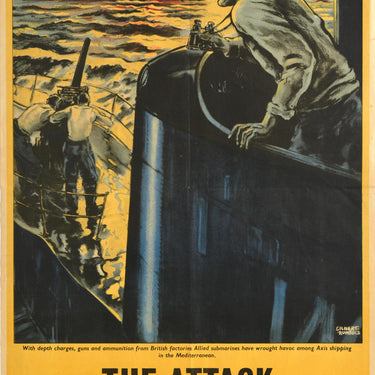 Original vintage World War Two poster - The Attack Begins in the Factory - featuring a dramatic naval image of a Royal Navy submarine captain in a conning tower holding a pair binoculars and looking at two sailors below aiming a deck gun at a sinking ship engulfed in fire with the flames lighting up the night sky reflected on the sea, the smoke rising in the background with the bold title text on the margin below and the caption - With depth charges, guns and ammunition from British factories Allied submarines have wrought havoc among Axis shipping in the Mediterranean. Printed in England by Chromoworks Ltd London. Very good condition, creasing, tears, folds, staining.