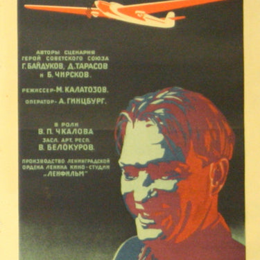 Original vintage movie poster for the film about Valery Chkalov (1904-1938), the legendary Russian pilot who was awarded Hero of the Soviet Union and Order of Lenin. Printed in Riga. Good condition, pin holes, repaired tears.