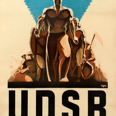 Original vintage propaganda poster - Venez U.D.S.R. - Come to UDSR - featuring a dynamic design by Bernard Lancy (1892-1964) of a crowd of workers holding farm and industrial tools marching behind a man leading the group and reaching out his hand towards the viewer to show unity with a construction crane and buildings in the background. Founded in 1945 after the liberation of France from German occupation, the Union démocratique et socialiste de la Résistance (UDSR) / Democratic and Socialist Union of the Resistance was a French political party set up by non-Communist members of the Liberation; it was active until 1964 (mainly during the Fourth Republic 1947-1958) when it merged into the Convention of Republican Institutions (CIR) led by the left wing politician Francois Mitterrand. Large size. Excellent condition, backed on linen.