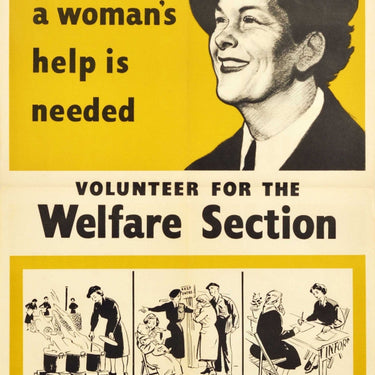 Original vintage recruitment poster - Where a woman's help is needed Volunteer for the Welfare Section Civil Defence Corps Ask at your Council Offices - featuring an illustration of a smiling lady wearing a Civil Defence CD uniform hat with three images below depicting volunteers working and helping at a soup kitchen cooking outdoors, at a hospital clinic directing a mother and baby at a rest centre and providing information to those in need. Issued by H.M. Government. Very good condition, folds, creasing.