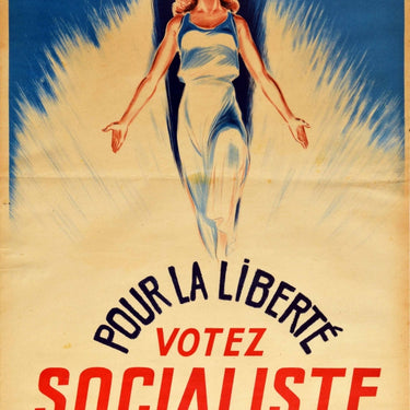 Original vintage propaganda poster issued by the Section Francaise de l'Internationale Ouvriere SFIO - The French Section of the Workers' International - featuring an illustration of a young blonde lady in a long dress (as the national personification of the French Republic Marianne of France) holding her arms out and taking a step forward with a white shining light against the blue background. The text below the image in black and red reads - Pour la Liberte votez Socialiste SFIO / For Freedom vote Socialist SFIO. Artwork by Paul Ordner (1900-1969). SFIO, a political party, was founded in 1905 and dissolved in 1969 to transform into the Socialist Party. Good condition, staining, tears, folds, creasing.