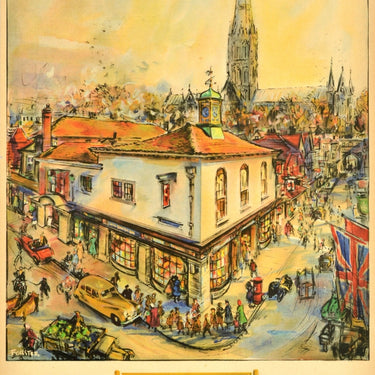 Original vintage advertising poster for Britain's Famous Bookshops WH Smith & Son's Shop Salisbury featuring a busy street scene with cars and trucks on the road, a group of children passing by the store on the corner and people looking into the windows, a Union Jack flag flying in the foreground and Salisbury Cathedral in the background with the title text on the border below. WH Smith was the world's first high street chain store company, founded in London in 1792 by husband and wife, Henry Walton and Anna Smith, selling newspapers, magazines, stationery, books etc. Issued by the Publicity Department of W.H. Smith & Son, Ltd. Printed by Ernest J. Day and Co., Ltd, London. Good condition, tears, creasing, staining, paper losses on edges.