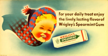 Original vintage poster for Wrigley's Spearmint, for your daily treat enjoy the lively lasting flavor of Wrigley's spearmint gum. CC-5P-6-50. Horizontal. Good condition, minor soiling, bumps and losses on margins.